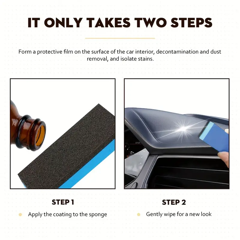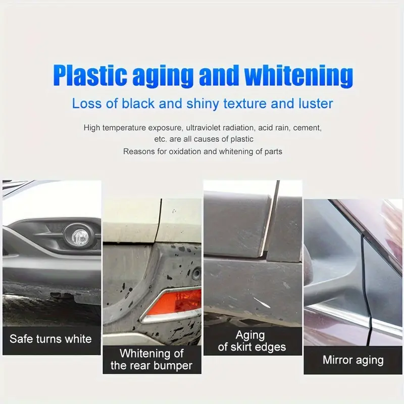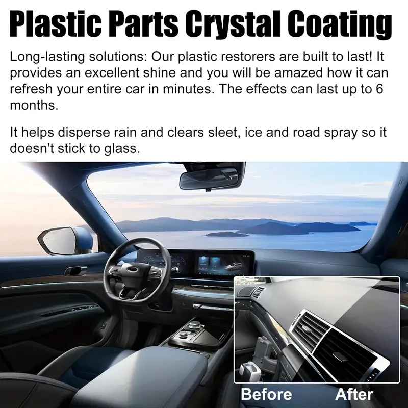 Are your car’s plastic parts looking faded and worn out? Say goodbye to dull, old surfaces and hello to a shiny, brand-new look with our Plastic Parts Crystal Coating! With just one easy application, our advanced Plastic Parts Refurbish Agent works wonders on all exterior and interior plastic parts of your car. Simply apply the formula to the sponge and wipe — it’s that easy! Watch as your car’s plastic surfaces transform from dull and faded to glossy and vibrant.
